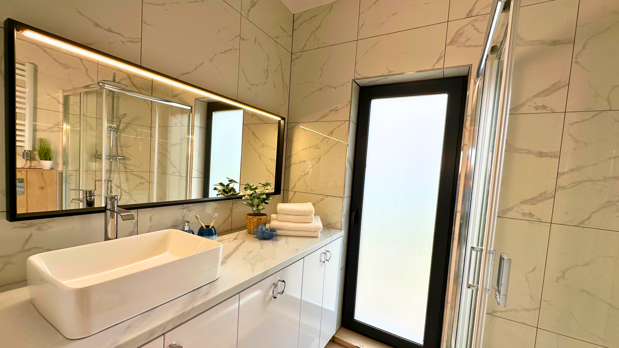 Łazienka została wyposażona w prysznic, toaletę, duże lustro, świeże ręczniki, suszarkę do włosów, żelazko z deską do prasowania oraz apteczkę.